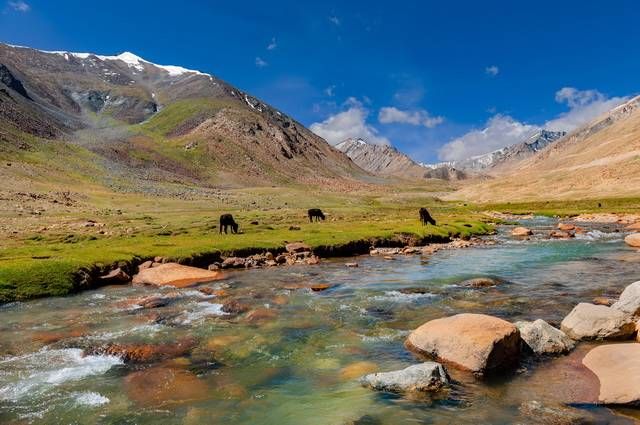 Départ pour la vallée de la Nubra, par le col de Khardung La (5 602 m), sur la plus haute route carrossable du monde, à travers des paysages à couper le souffle avec, au loin, les mythiques sommets du Karakoram. Arrivée à Sumur (3 096 m) et installation au lodge, en bordure de rivière. Déjeuner puis excursion au petit gompa de Samstemling, abritant une jolie collection de tangkas et de fresques centenaires, et arrêt aux sources d’eau chaude de Panamik. (P.déj+Déj+Dîn)