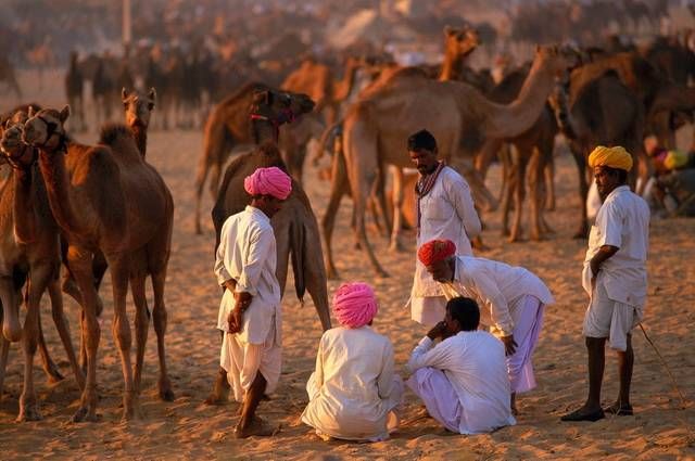 Départ pour la ville sainte de Pushkar, important centre de pèlerinage pour les Hindous qui accueille chaque année, autour de la pleine lune de novembre, l’une des plus importantes foires aux chameaux du pays. Arrivée au campement pour déjeuner, installation et après-midi libre, en compagnie de votre guide, pour assister à ce grand barnum bigarré, où se mêlent animaux richement harnachés, rajpoutes enturbannés et femmes parées de saris multicolores. (P.déj+Déj+Dîn)