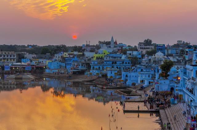 Visite de la ville, autrefois surnommée la « cité des sources » en raison de ses nombreux bassins et points d’eau : le fort Taragarh, avec ses délicates peintures murales du 18e s. représentant la vie de Krishna, et l’étonnant puits en escalier de Raniji-ki-Baori. Puis route pour la ville sainte de Pushkar qui accueille chaque année, à l’approche de la pleine lune de novembre, l’une des plus célèbres foires du pays. Arrivée au campement pour déjeuner et après-midi libre, en compagnie de votre guide, pour assister à ce grand barnum bigarré, où se mêlent animaux richement harnachés, rajpoutes enturbannés et femmes parées de saris multicolores. (P.déj+Déj+Dîn)