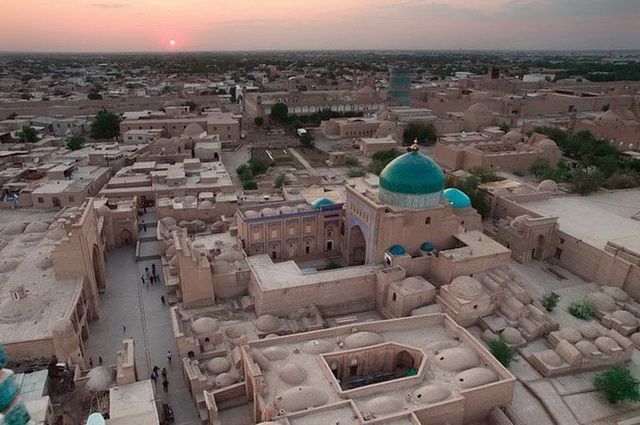 Transfert matinal pour l’aéroport et envol pour Ourguentch (1h30) et découverte de la vieille ville de Khiva, classée à l’UNESCO : la citadelle, le palais Tach Khaouli, le haut minaret de la médersa Islam Khodja, celui inachevé de Kalta Minor, la mosquée du Vendredi aux 218 colonnes de bois sculpté et le mausolée du poète Pakhlavan Mahmoud. (P.déj+Déj)