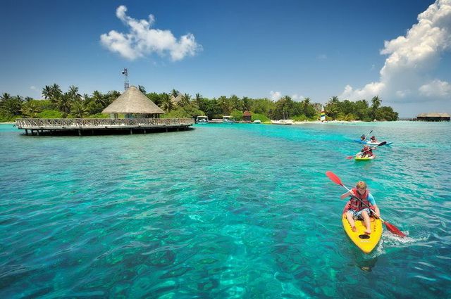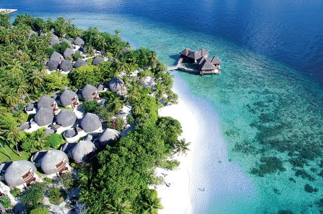 A 15 min en bateau de l’aéroport de Malé, sur une île luxuriante entourée de lagons turquoise.